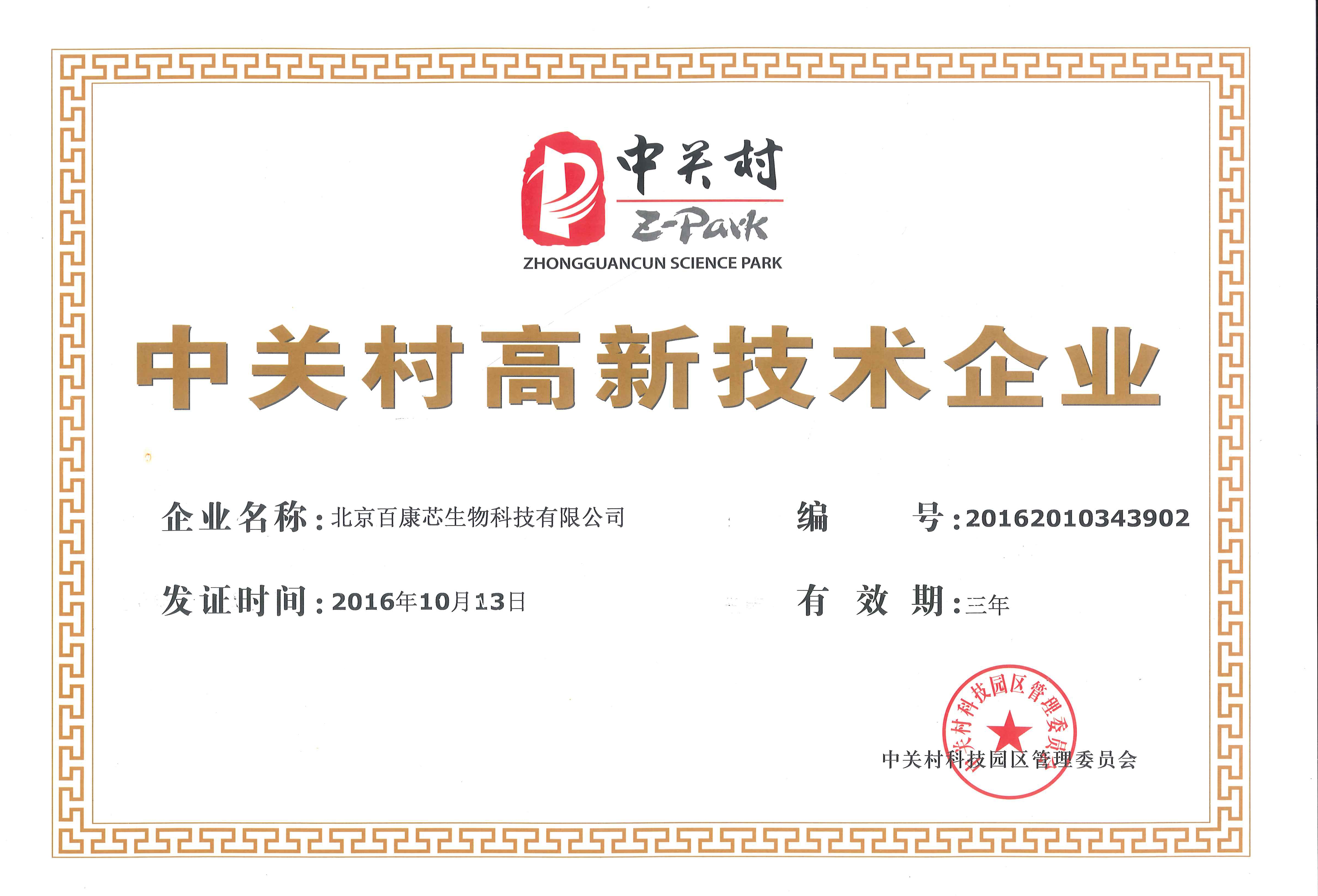 2016年10月14日,北京百康芯生物科技有限公司成功通過(guò)中關(guān)村高新技術(shù)企業(yè)認(rèn)定,正式榮獲由北京中關(guān)村科技園區(qū)管理委員會(huì)頒發(fā)的“中關(guān)村高新