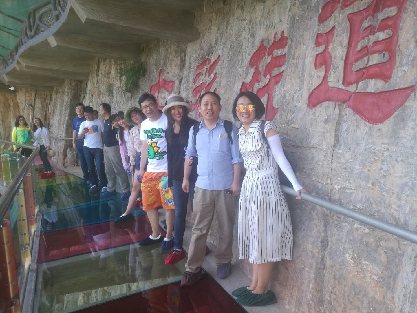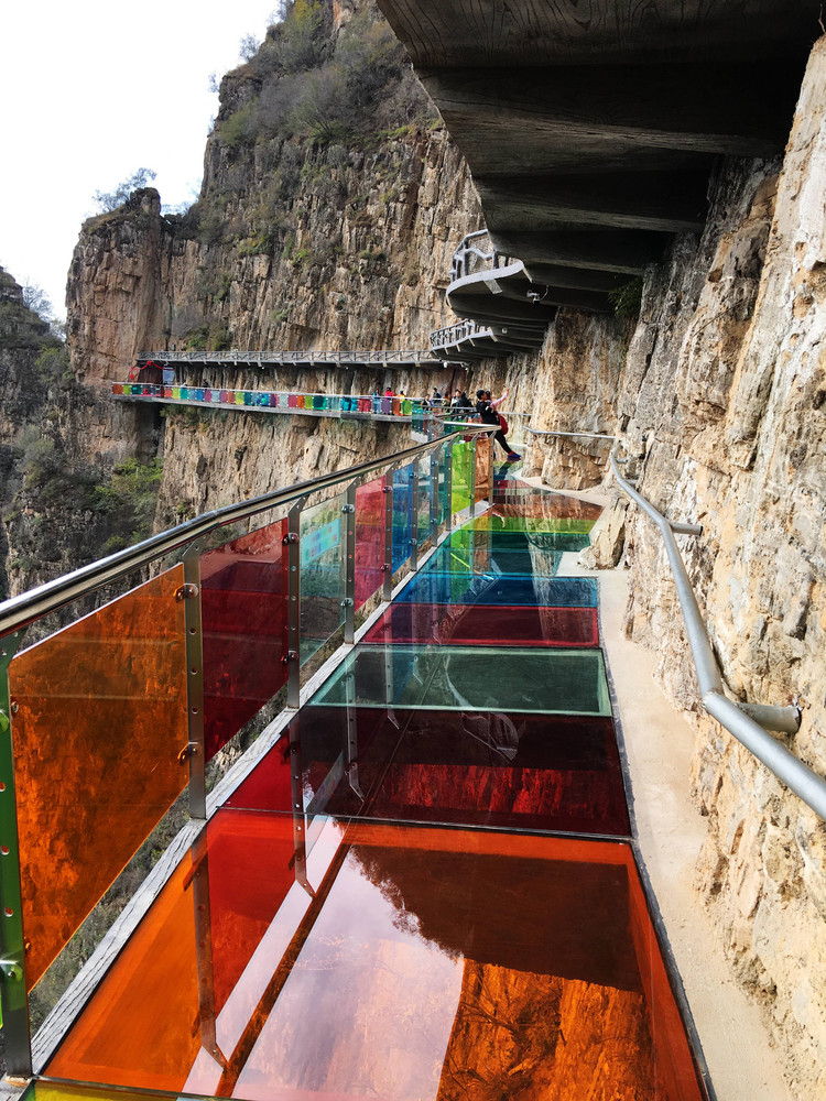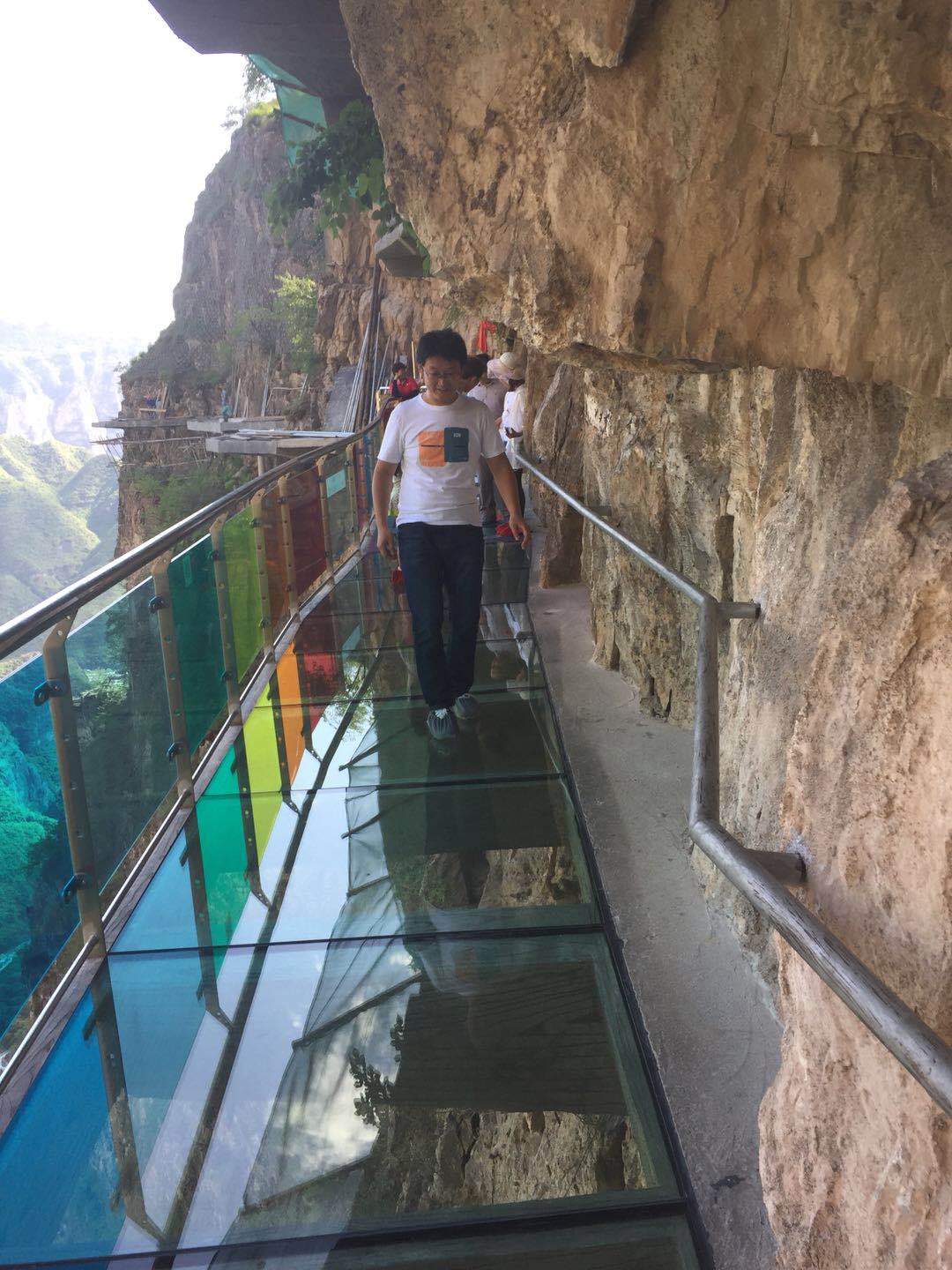 (豐盛的農(nóng)家菜) 團(tuán)建活動(dòng)part 2:挑戰(zhàn)七彩玻璃棧道 吃過(guò)午飯,一行人乘車去往東湖港。東湖港的玻璃棧道是七彩的,這是國(guó)內(nèi)首家“七彩玻璃棧道”,挑戰(zhàn)區(qū)全長(zhǎng)1200米,其中七彩玻璃128米,高差600余米。走在玻璃棧道上,猶如踩著一條長(zhǎng)長(zhǎng)的彩虹橋,驚險(xiǎn)刺激而又不失浪漫夢(mèng)幻!