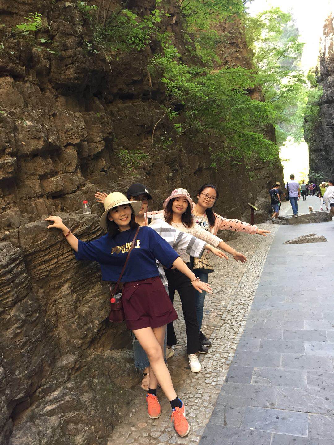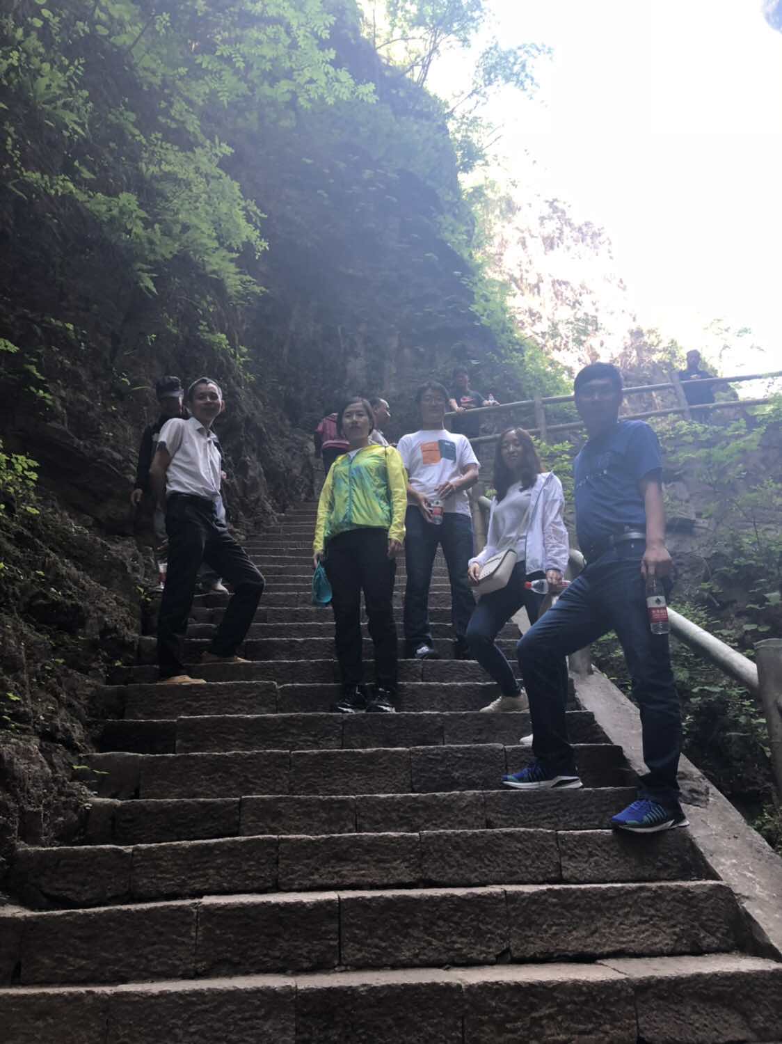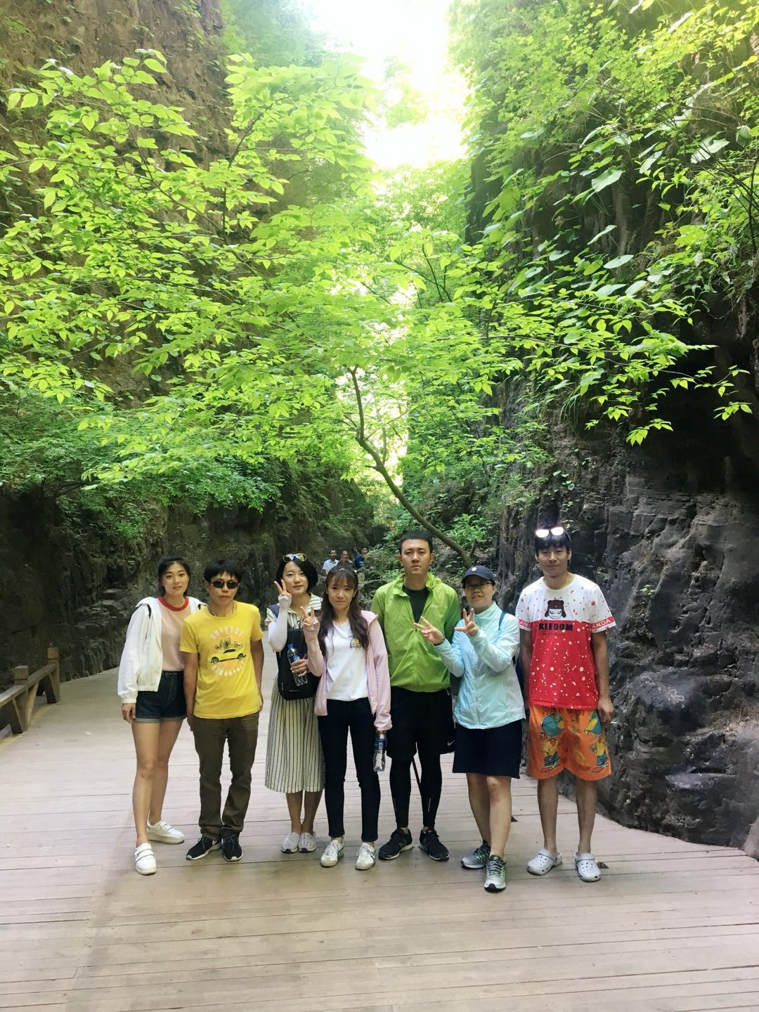 團(tuán)建活動(dòng)part 4:游覽“天下第一峽” 團(tuán)建第二天我們要去到的是被譽(yù)為“天下第一峽”的百里峽景區(qū),聽(tīng)聞百里峽天梯有三千余階,可是嚇?biāo)馈皩殞殏儭蹦兀液媒?jīng)過(guò)一夜的休息,大家精力已恢復(fù)大半。 走在狹窄的峽谷中,駐足而望,兩側(cè)聳然屹立的翠色絕壁,頭頂上若隱若現(xiàn)的一線天光,遠(yuǎn)處山巔的藍(lán)天白云,腳下忽左忽右的溪流……若不是那彩色纜車過(guò)于美好,“小芯”肯定是要徒步登上山頂?shù)?!沒(méi)錯(cuò),“小芯”真的是被纜車“色誘”過(guò)去的?。?!